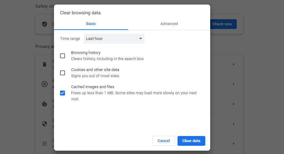 Google Chrome browser's Clear browsing data pop-up window with only the "Cached images and files" box checked.
