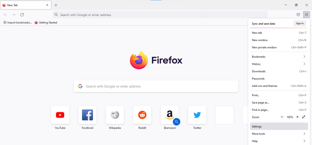 Mozilla Firefox browser's application drop-down menu opened with the "Settings" option highlighted.