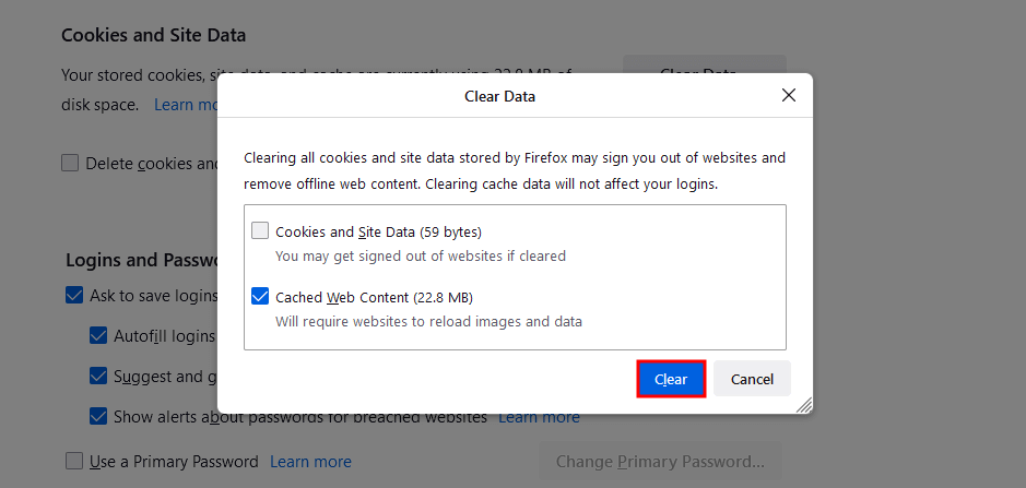- Click the Clear button to delete the Firefox cache.
