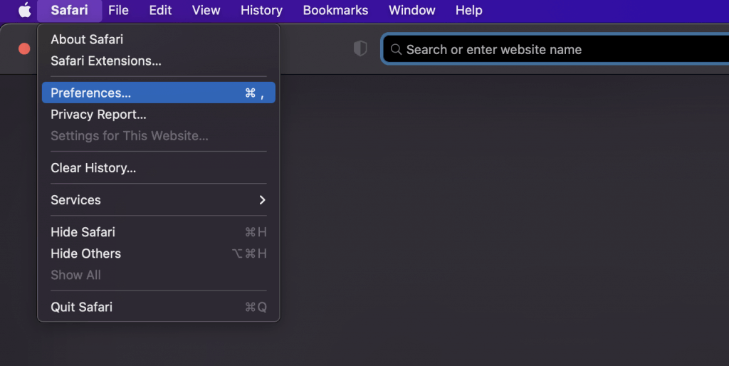- Click the Safari menu tab from the bar on top of the screen and select Preferences…