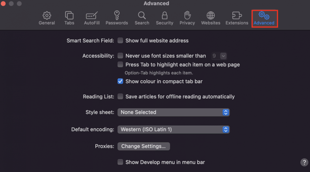 Advanced page of Safari browser's Preferences pop-up window with the Advanced tab highlighted.