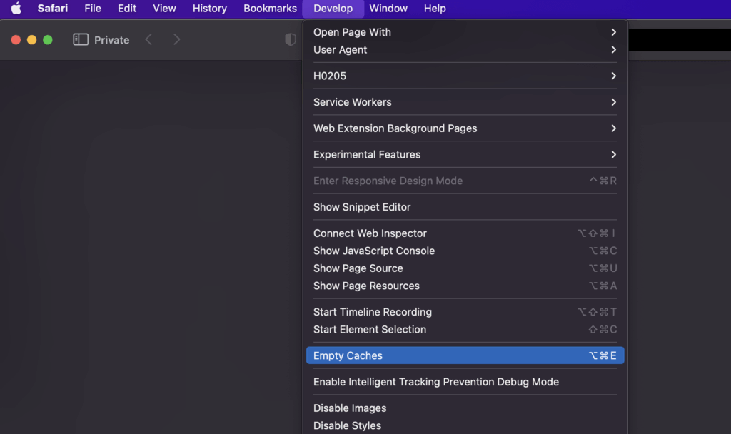 - Click on the Develop tab on the Safari menu bar at the top of the screen and select Empty Caches.
