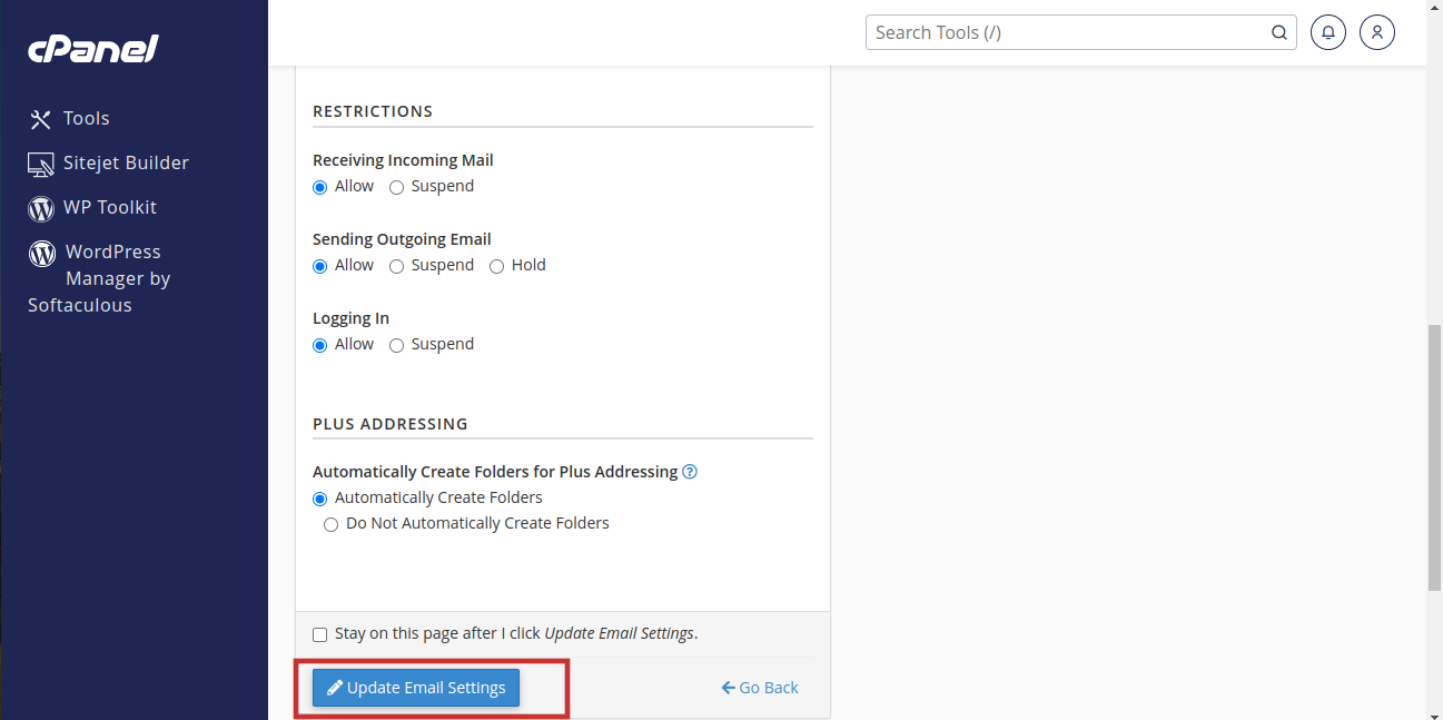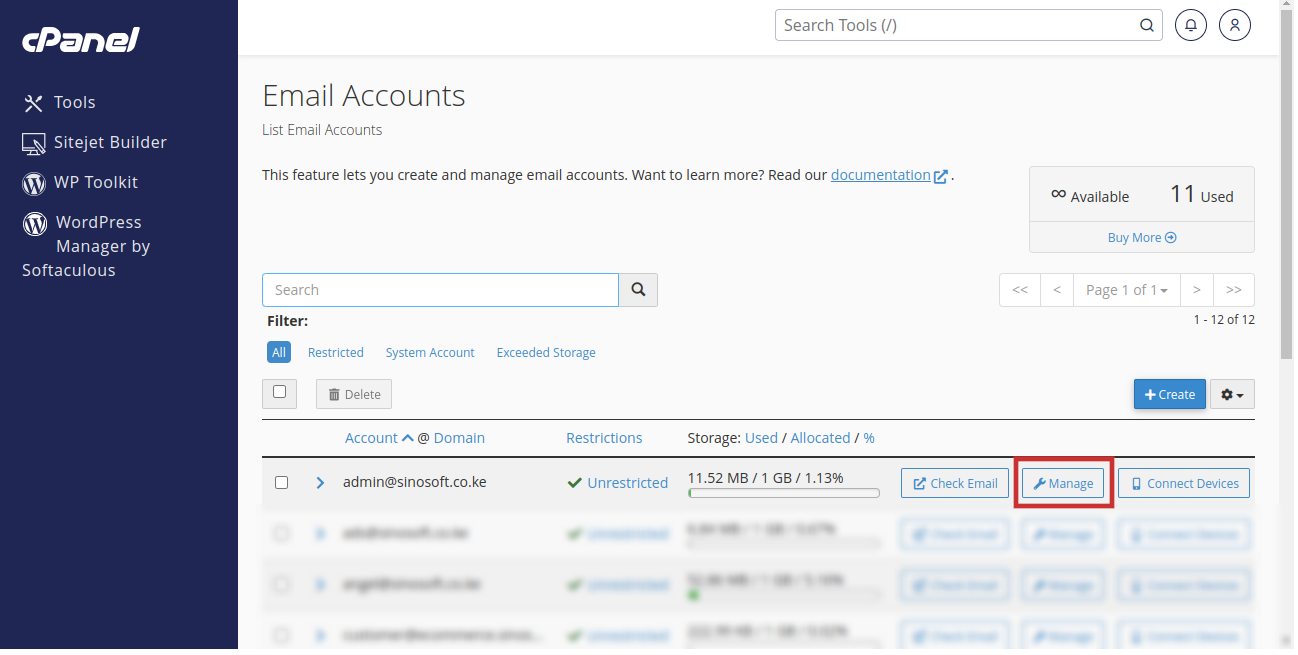 Find the account you want to adjust in the list of existing email accounts. Next to the email account, click on the Manage button.