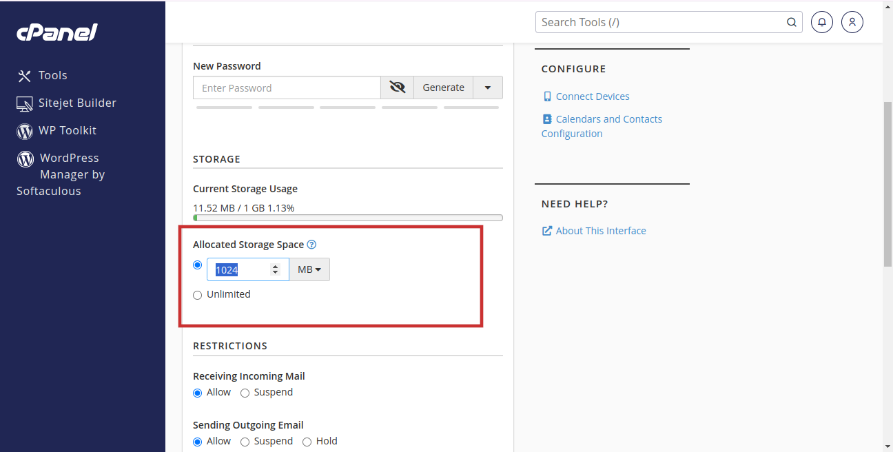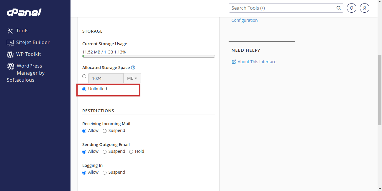 Here, you can either enter a new quota (in MB or GB) or select the Unlimited option if you want to remove any limits.