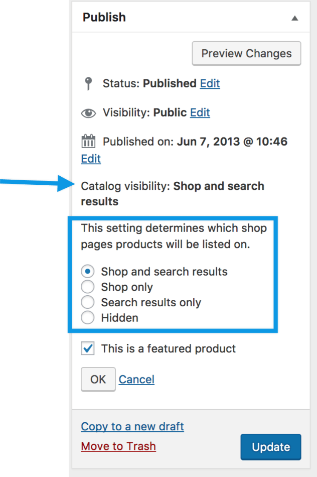 - Shop only – Visible in shop pages and category pages, but not search results.