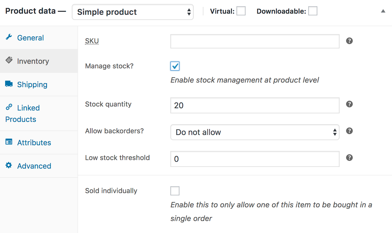 - Tick the Sold Individually box to limit the product to one per order.