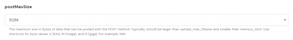 Important: Note that the postMaxSize should always be larger than uploadMaxFilesize to avoid errors when uploading data.